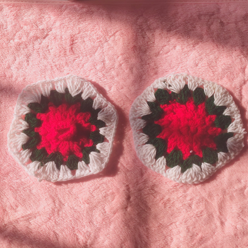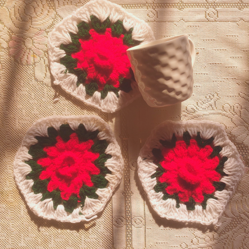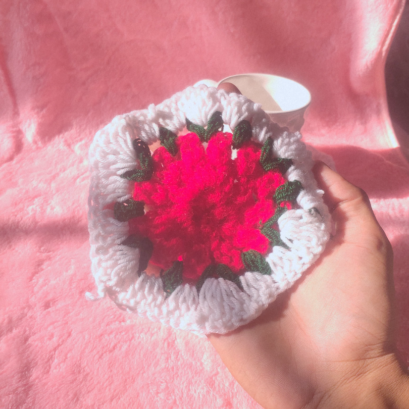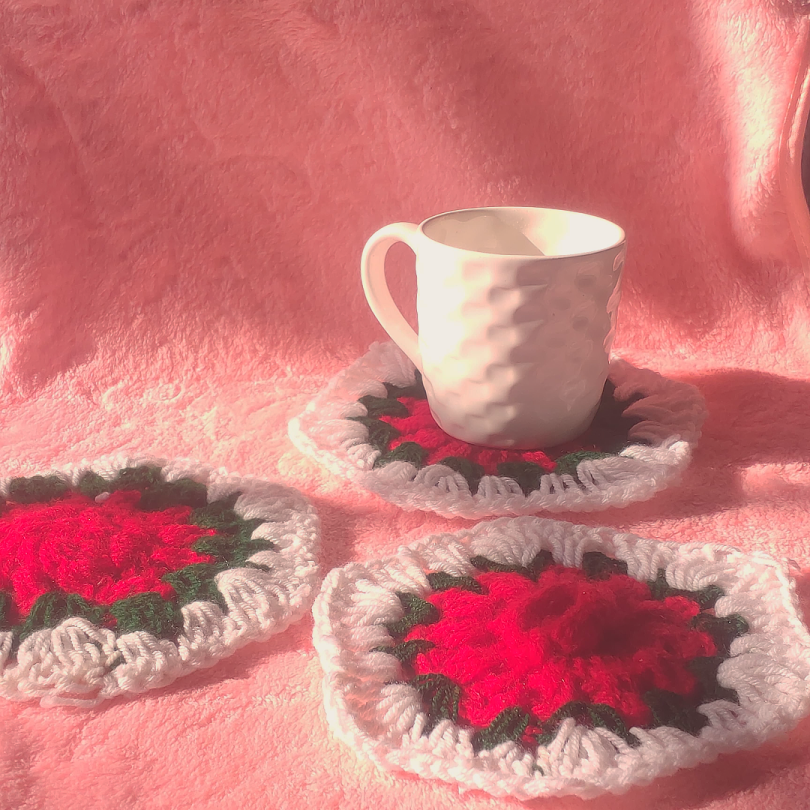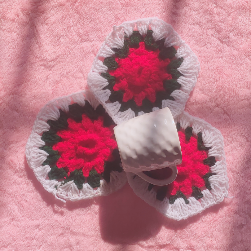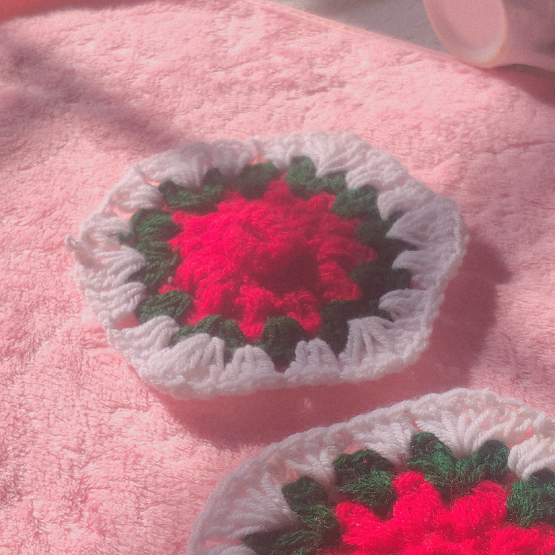 Brighten up your coffee breaks with these adorable crochet coasters! 🌸 Each one is handmade with love, featuring a cute, poppy-redish pink flower design framed by soft white and leafy green details. Perfect for adding a touch of cozy charm to your table, these coasters are as practical as they are pretty! Whether you're sipping tea, enjoying coffee, or just adding a bit of flair to your decor, these sweet little coasters will make every moment feel extra special. Gift them to a friend or treat yourself-because cute moments deserve cute coasters! 💖✨