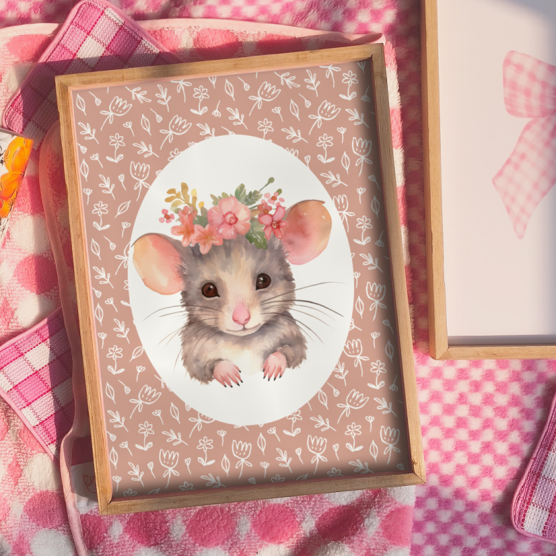 Cute floral mouse wall print